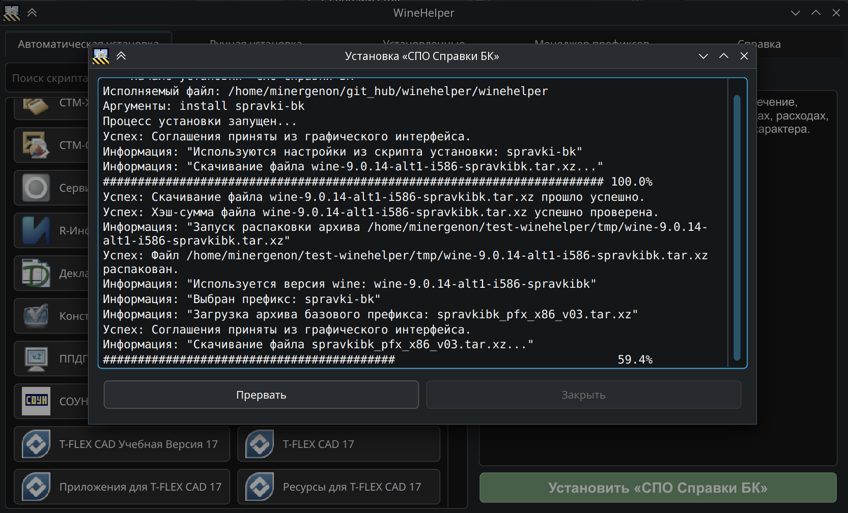 При первом запуске WineHelper проверяются и при необходимости устанавливаются дополнительные зависимости (запрашиваются права root).