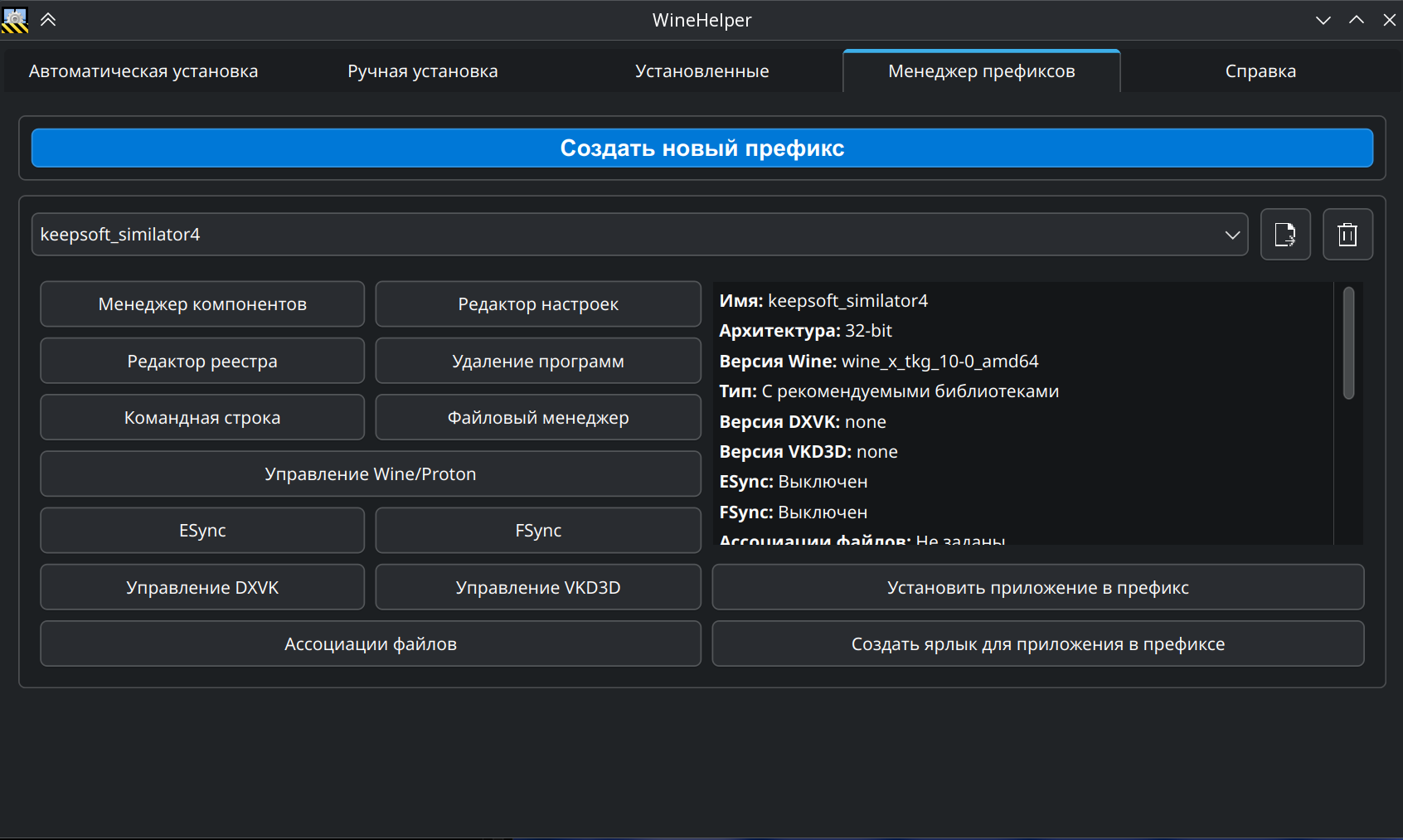 Эта вкладка предоставляет мощные инструменты для управления префиксами Wine.