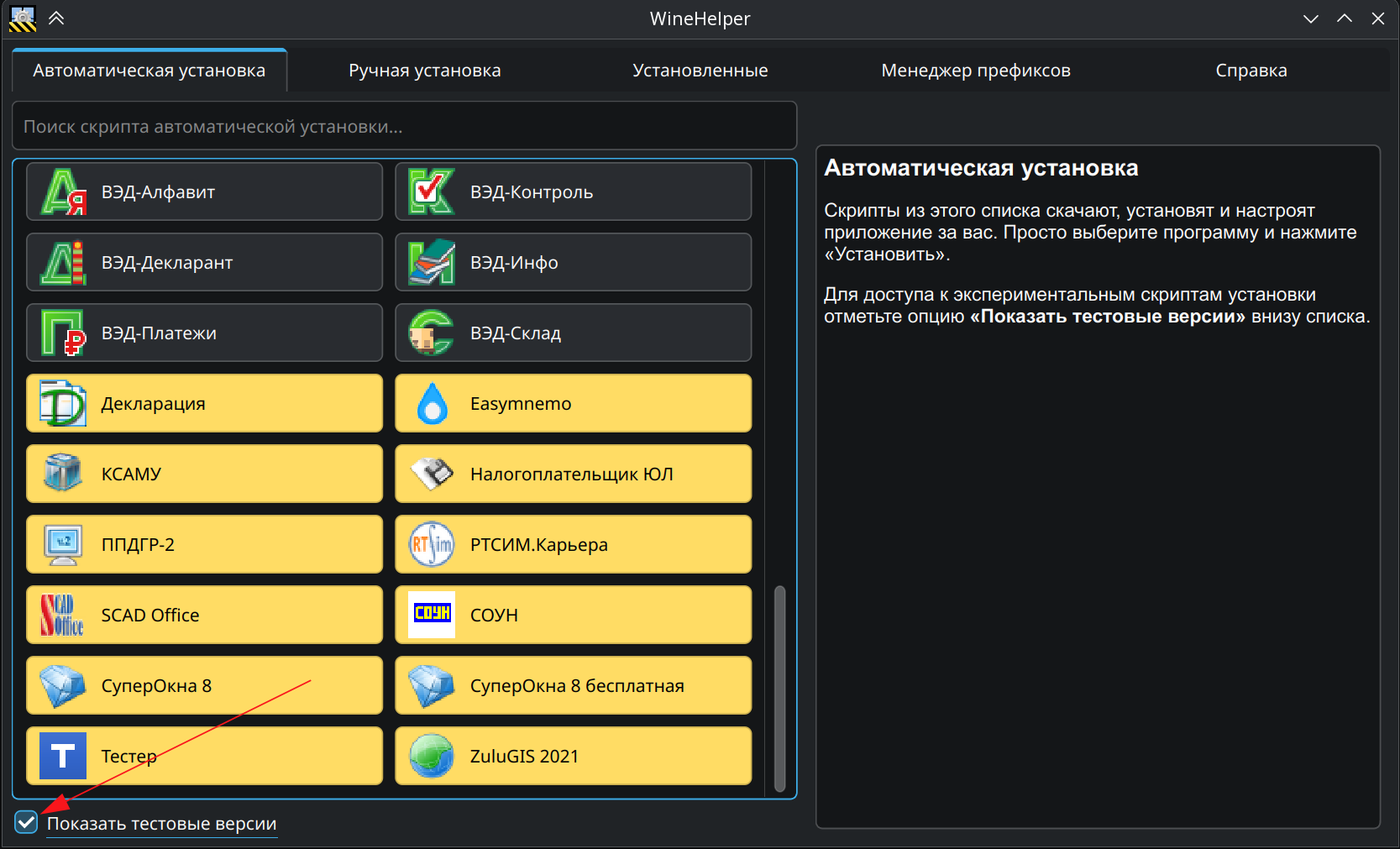 Так же на вкладке Автоматическая установка есть чекбокс с тестовыми версиями скриптов установки которые еще не прошли полную проверку на зависимости и совместимость, но уже можно попробовать в работе.