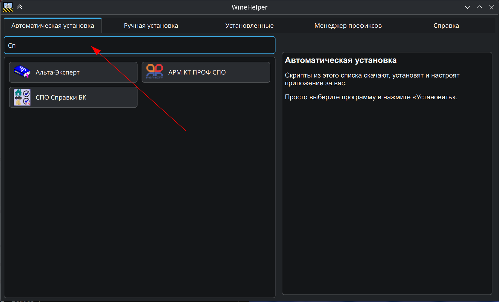 На этой вкладке отображаются все приложения, которые были установлены с помощью WineHelper.