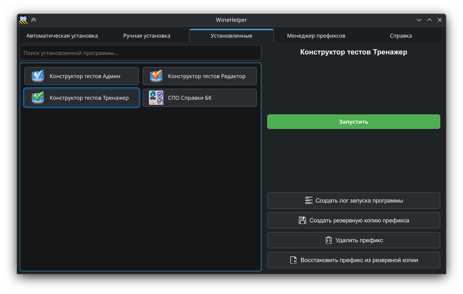 На этой вкладке отображаются все приложения, которые были установлены с помощью WineHelper.