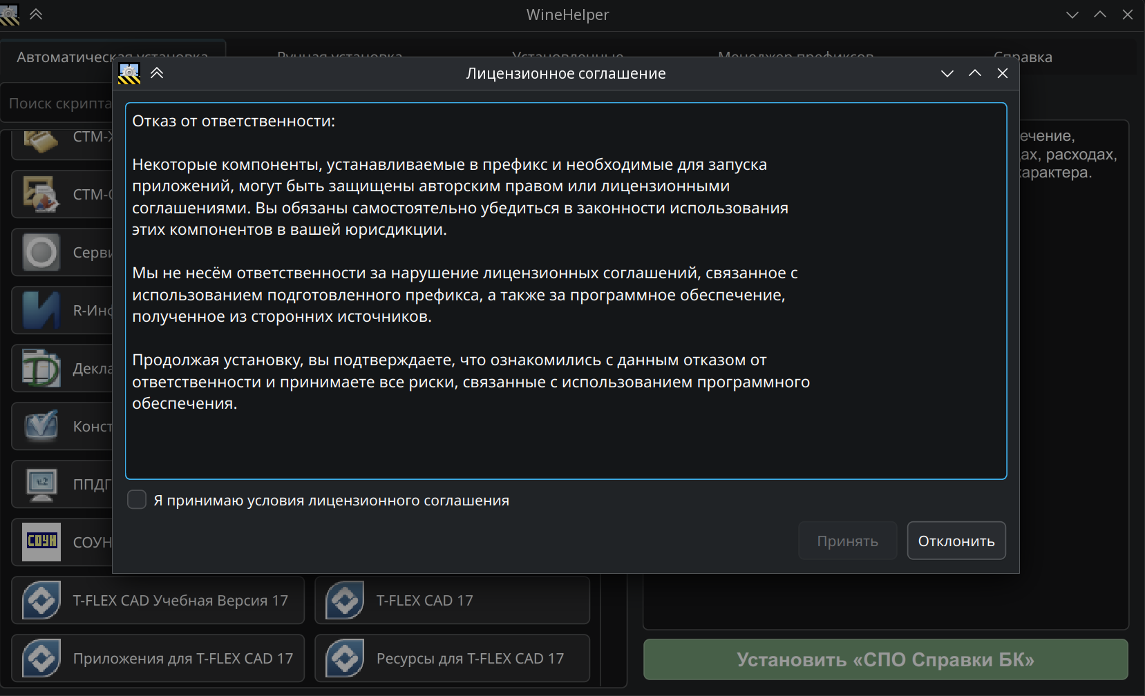 При первом запуске WineHelper проверяются и при необходимости устанавливаются дополнительные зависимости (запрашиваются права root).