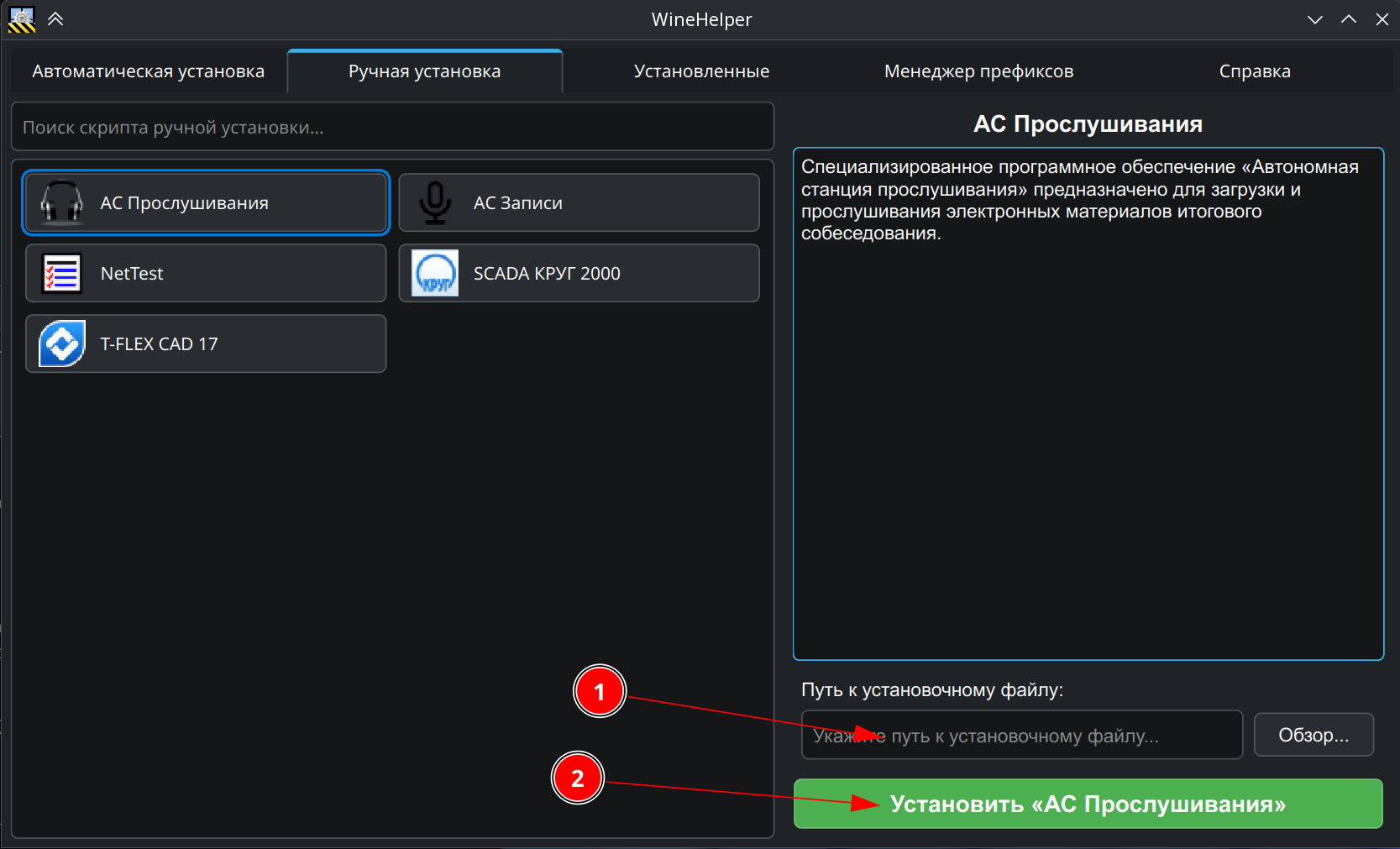 Для ручной установки дополнительно потребуется указать путь к установочному файлу (.exe или .msi), который вы скачали самостоятельно.
