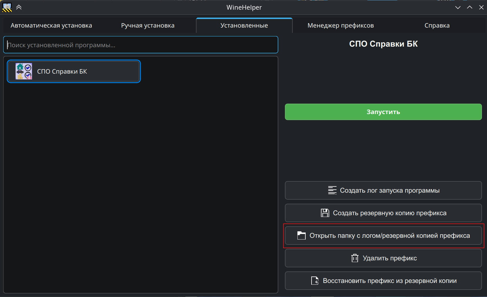 winehelper.log. - Создать резервную копию префикса: Создает полный бэкап префикса приложения (включая версию Wine) в формате